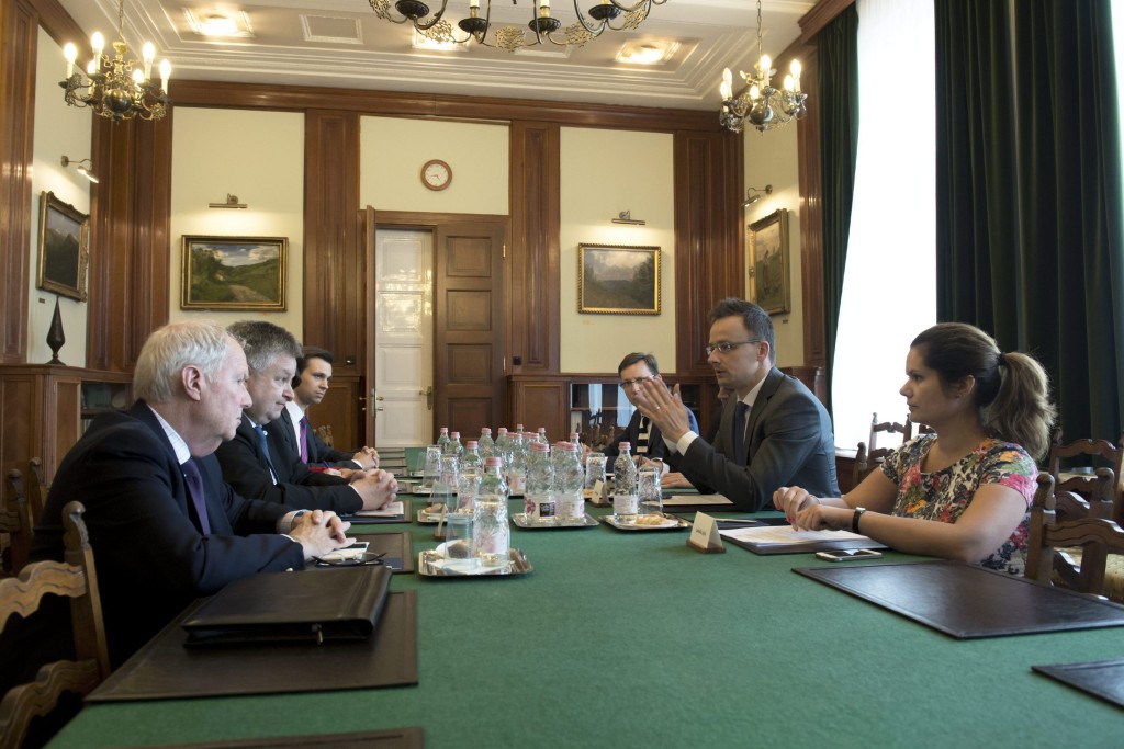 A Külgazdasági és Külügyminisztérium (KKM) által közreadott képen Szijjártó Péter külgazdasági és külügyminiszter (j2) megbeszélést folytat Michael Georg Linkkel, az Európai Biztonsági és Együttmûködési Szervezet (EBESZ) Demokratikus Intézmények és Emberi Jogok Irodája igazgatójával (b2) Budapesten 2015. június 18-án. A találkozón részt vett Andrew Baker rabbi, a soros EBESZ-elnökség antiszemitizmus elleni küzdelemmel foglalkozó személyes megbízottja (b) is.