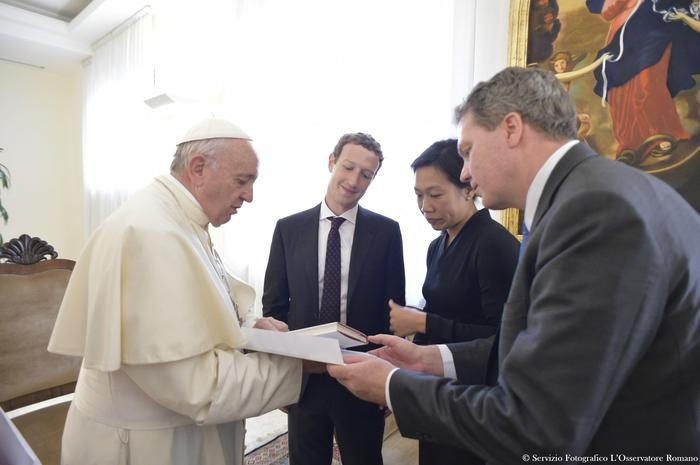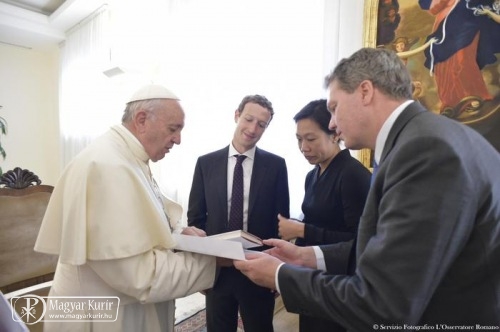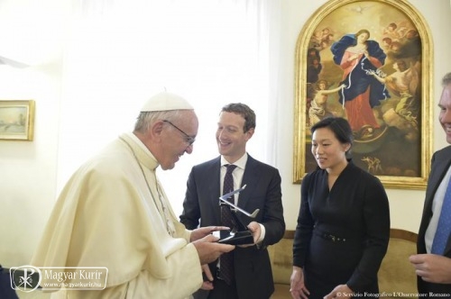 „A Szentatya ma [augusztus 29-én, hétfőn] fogadta Mark Zuckerberget, a Facebook alapítóját, ügyvezető igazgatóját és feleségét, Priscilla Chant. Arról beszéltek, hogyan lehet használni a kommunikációs technológiákat, hogy enyhítsék a szegénységet, bátorítsák a találkozás kultúráját és segítsenek eljuttatni a reménység üzenetét, különösen a leghátrányosabb helyzetű emberekhez.”