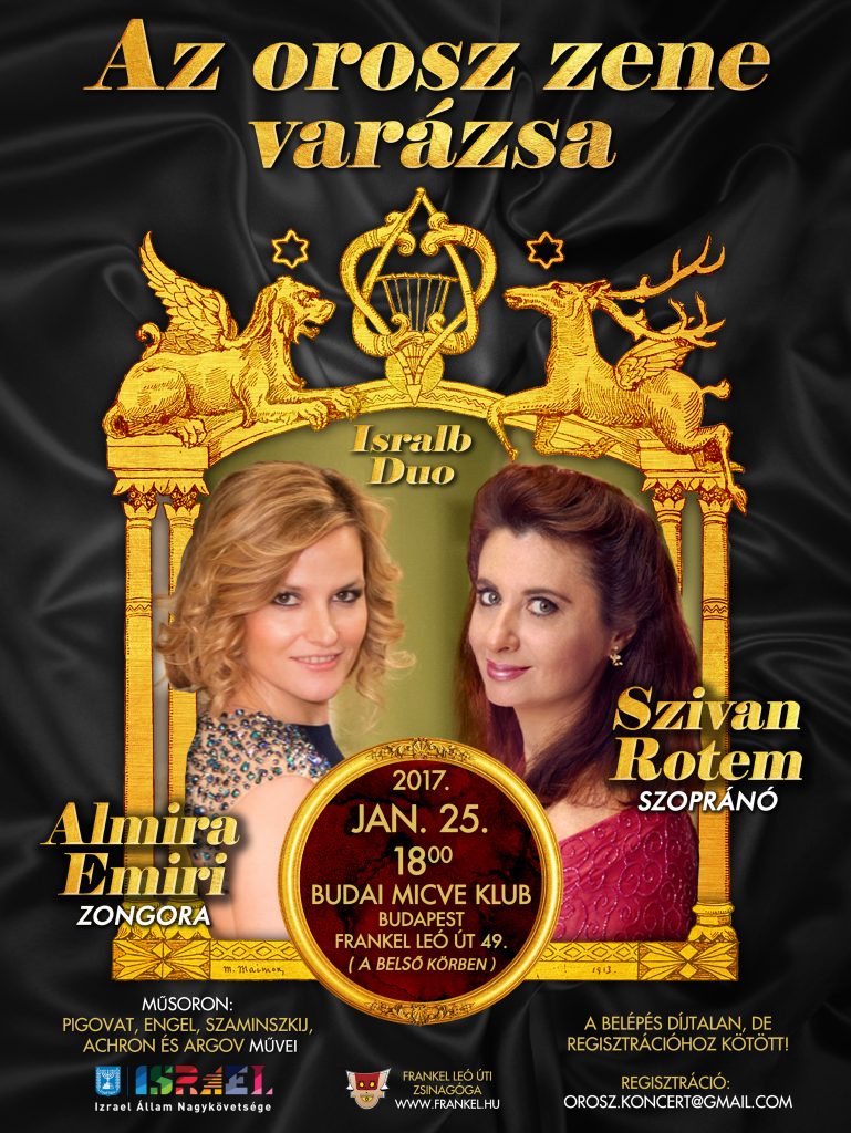Az orosz zene varázsa címmel különleges koncertet ad Almira Emiri albán zongoraművész és Szivan Rotem izraeli operaénekes 2017. január 25-én a Budai Micve Klubban 18 órakor (Frankel Leó u. 49.), január 26-án az Orosz Kulturális Központban 19 órakor (Andrássy u. 120.) és január 28-án Győrben 17 órakor, az egykori zsinagógában (Kossuth Lajos u. 5.).
