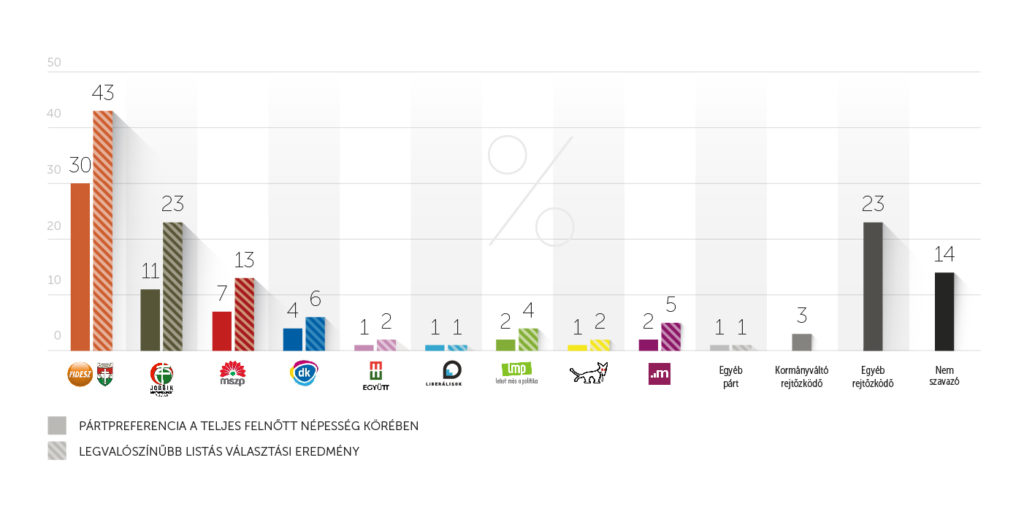 A legvalószínűbb listás választási eredményeket nézve (a választási részvételüket biztosra ígérők potenciális pártpreferenciája) a Fidesz-KDNP 43 százalékon áll. A Jobbik a listás szavazatok 23, az MSZP 13, a DK 6, a Momentum 5 százalékát szerezné meg. Ezen a bázison az LMP tábora 4 százalékos, míg a Kétfarkú Kutya Párt és az Együtt 2-2, a Liberálisok pedig 1 százalékon állnak.
