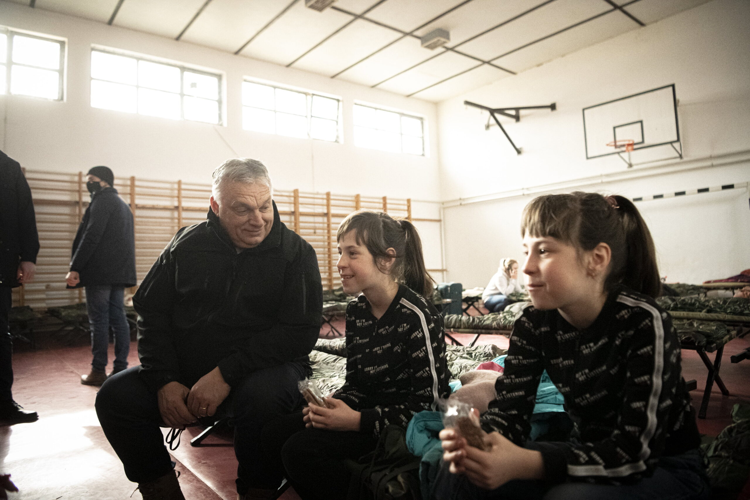 A Miniszterelnöki Sajtóiroda által közreadott képen Orbán Viktor miniszterelnök gyerekekkel beszélget a háború miatt Ukrajnából Magyarországra menekülõk számára kialakított segítségponton Beregsurányban 2022. március 3-án.