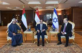megerősítésének módjait ,,minden szinten”. Az egyiptomi elnöki hivatal tájékoztatása szerint a találkozón megvitatták az ukrajnai háborút és annak energiapiacra, világgazdaságra és a világ élelmiszerellátására gyakorolt hatását. Bennett és az Emírségek trónörököse hétfőn érkezett Egyiptomba, hogy részt vegyen a maga nemében első háromoldalú csúcstalálkozón . Bennett miniszterelnök az éjszakát Sarm es-Sejken töltötte. Ez volt első alkalom, hogy egy izraeli miniszterelnök több mint 20 év után egyiptomi földön aludt. Szakértők a találkozót jelentős és példátlan fejleményként értékelték, mely diplomáciai szempontból újabb mérföldkőnek tekinthető az Ábrahám-egyezmények végrehajtásában. Egy diplomáciai forrás szerint Bennett azért ment Egyiptomba, hogy az ukrajnai háború hátterében számos kérdésben segítsen. A csúcstalálkozó annak a törekvésnek a része, hogy