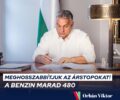 Az élelmiszer- és a benzinárstopot október 1-jéig, a hitelmoratóriumot és a kamatstopot december 31-ig meghosszabbítja a kormány – közölte Orbán Viktor miniszterelnök a közösségi-oldalán. „Meghosszabbítjuk az árstopokat! A benzin marad 480” – áll a bejegyzésben a kormányfő fényképe alatt. Az üzemanyag árát tavaly november 15-étől fagyasztották be Magyarországon, és 480 forintos áron rögzítették a benzin és a gázolaj esetében. Az árszabályozást közvetlenül az orosz–ukrán háború kitörése előtt hosszabbította meg a budapesti kabinet a február 15-től május 15-ig tartó időszakra, majd aztán júliusig. Május végén azonban az Orbán-kabinet arról is döntött, hogy csak magyar rendszámú autók tankolhatnak kedvezményes áron Magyarországon, ezzel kívánta a kormány visszaszorítani a benzinturizmust.