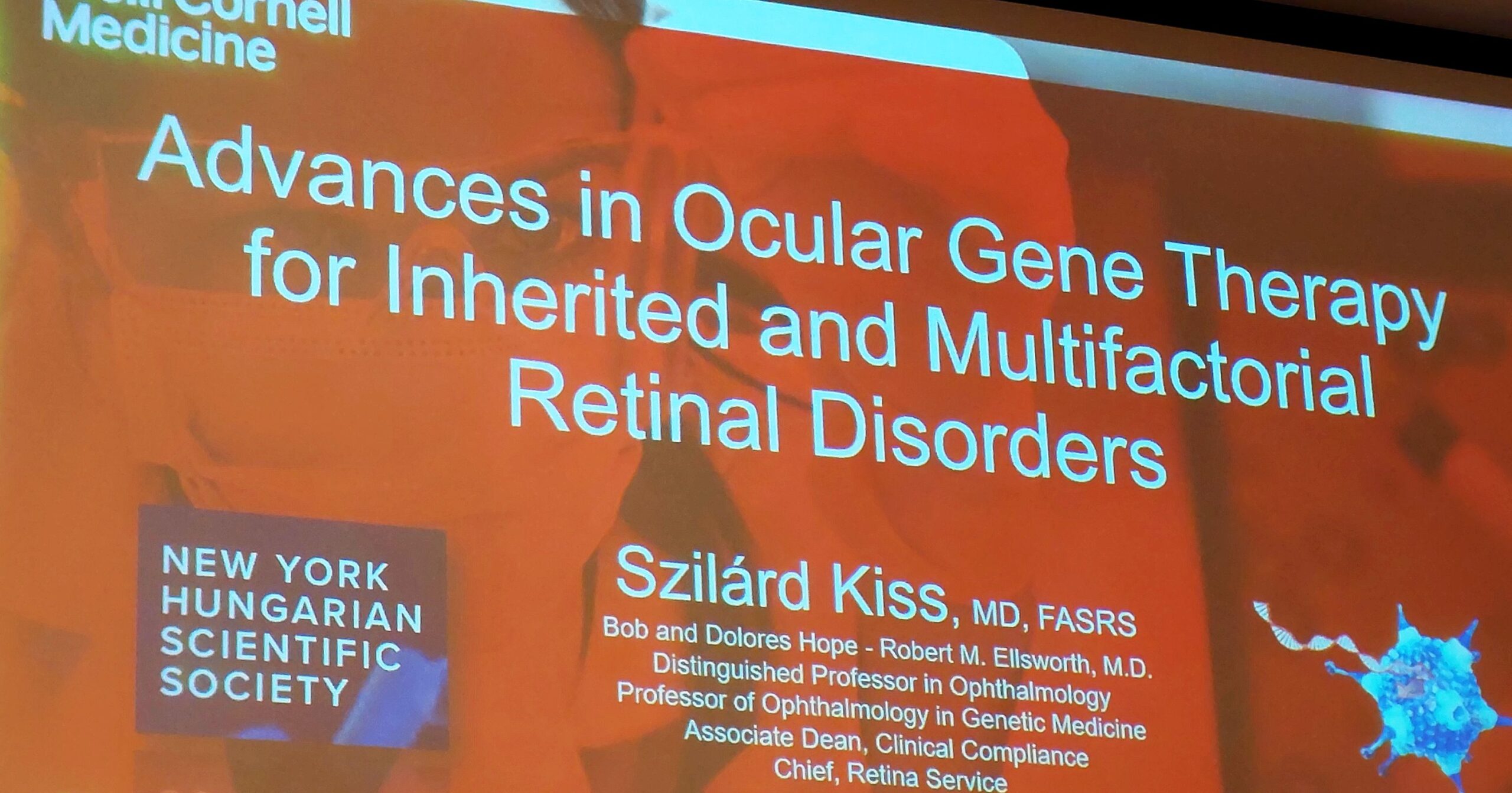 Kiss Szilárd a genetikai szemészet professzora a Weill Cornell Medical College, Israel Englander Szemészeti Tanszékén New Yorkban. Előadásában beszélt a Weill Cornell Medical Centerben végzett kutatásairól és összehasonlította a jelenleg használt gyógyszereket és a jövőjgyógyítási lehetőségeket. A résztvevők az előadást követően kérdéseket tehettek fel az előadó professzornak, aki részletesen válaszolt a kérdésekre.